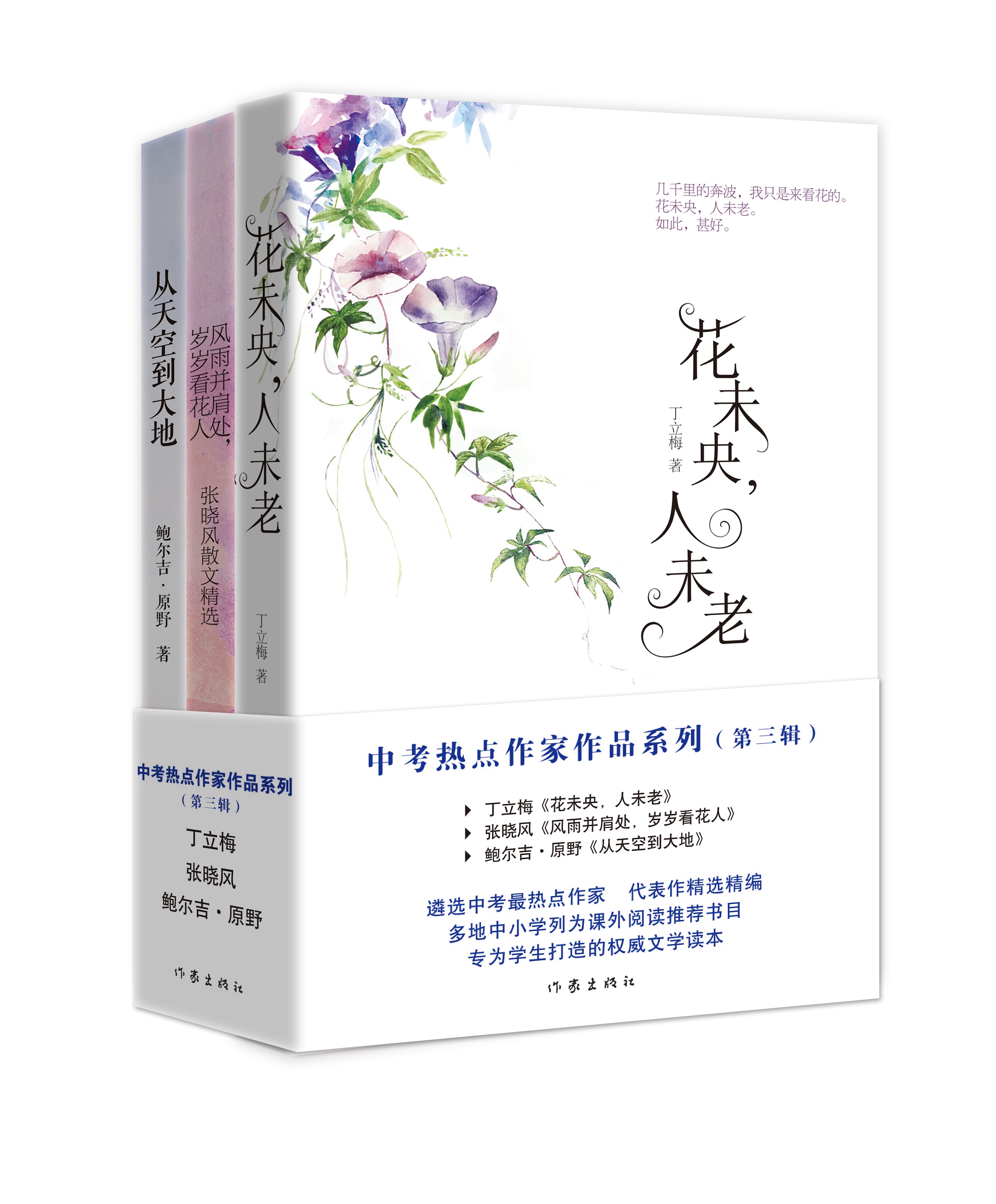 《花未央,人未老》:丁立梅全新散文自选集,分为“光阴如绣,蔓草生香”“卖得一枝花欲放”“森林笔记”“天上有云姓白”“昨日重现”“你在,就心安”“风知道”等七辑,收录丁立梅散文80余篇。丁立梅文笔细腻,清新温婉;作品清新,意境隽永。在看似平淡寻常的小场景小事件中,传递着爱与感动。带你细品用音乐煮出的文字,用文字感怀温暖的人生。上百篇文章被设计成语文考试现代文阅读材料,连续十年被选作中考试题。 《风雨并肩处,岁岁看花人》:张晓风散文精选集,分为“只因为年轻啊”“尘缘”“种种有情”“我交给你们一个孩子”“我喜欢”“不知有花”等六辑,收录张晓风散文七十余篇。张晓风的散文淡然平和,而内在深沉广阔,富于哲思,兼具浓厚的文化情怀,从寻常小事切入,点绘宽广的人生与大千世界的奥妙。余光中称赞其文笔“扬之有豪气,抑之有秀气,而即使在柔婉的时候,也带一点刚劲”。 《从天空到大地》:鲍尔吉·原野全新散文集,分为“天空”“大地”“河流”“季候”“雨”“树”“草”等十一辑,精选鲍尔吉·原野散文90余篇。鲍尔吉·原野的文章精微深邃、优美葱茏,透露着“独与天地精神往来”的云水情怀。